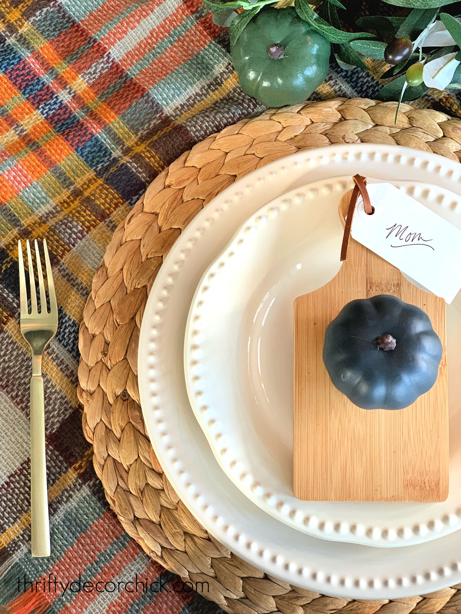 I discovered these lovely little slicing boards at Interest Foyer for $2 every, and determined to make use of them as place playing cards on high of the dishes. I had the paper tags in my craft stash, however you possibly can find them here as well