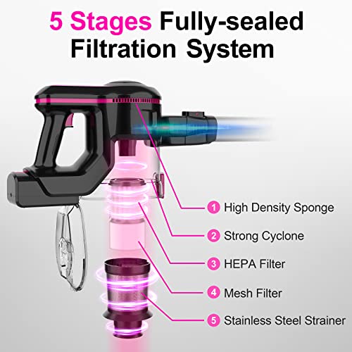 【5 Stages High-efficiency Filtration】With 5 stages fully sealed cyclone filtration system, the vacuum cleaner cordless captures 99.99% of fine particles as small as 0.1um and offers powerful centrifugal force to efficiently separate dirt. This rechargeable vacuum cordless provides the ultimate purified air and an excellent cleaning experience for every user. Note:the filter is washable. Regular cleaning of the filter/sponge will prevent weak suction and blockage.
